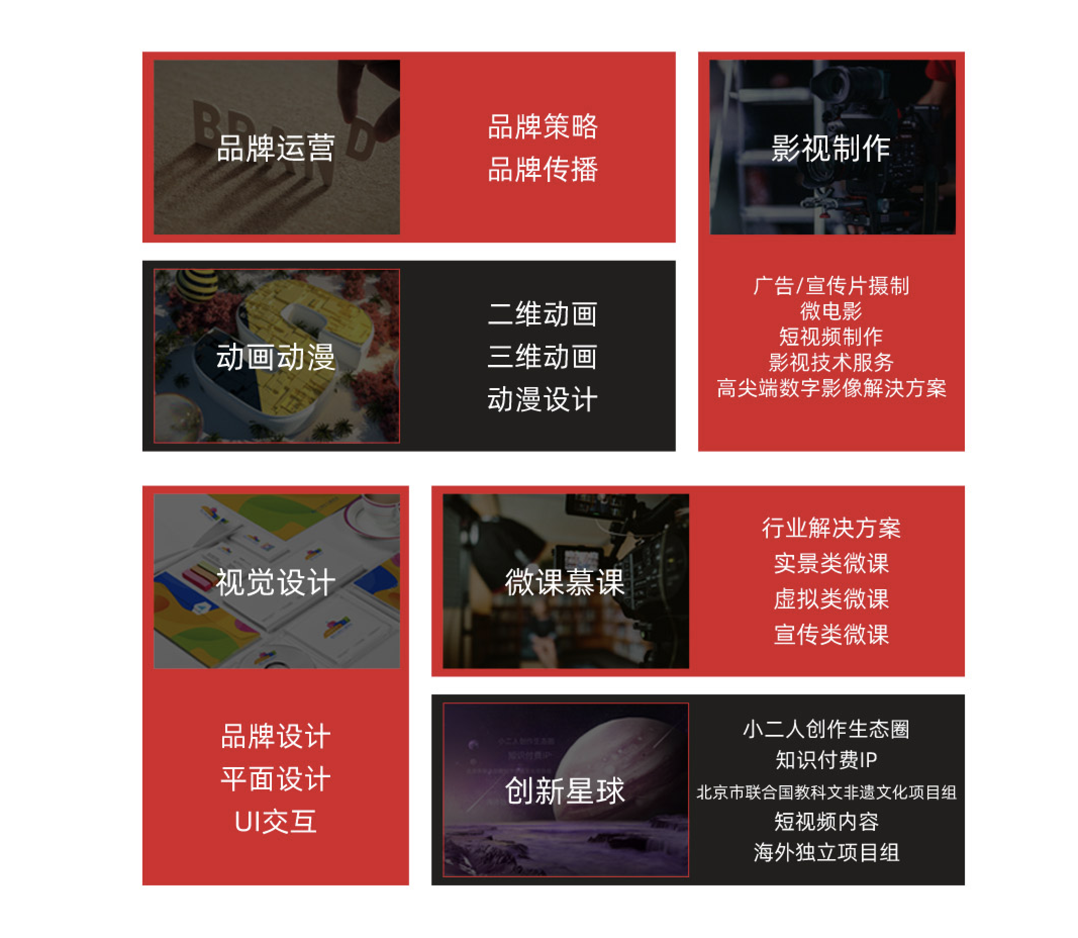月光宝盒传媒以内容创作为核心,集品牌运营、文案策划、影音摄制、数字化呈现、视觉设念、UI交互和互动推行于一体,共计7大类超过50项产品服务,为企业提供贯穿品牌宣扬推行全生命周期的内容制造处理方案。